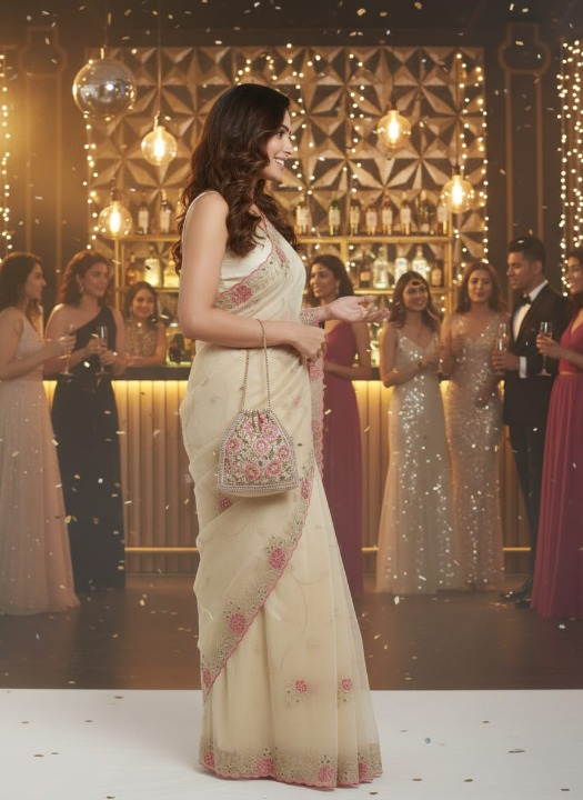 This Fancy Organza Saree in soft beige is a perfect blend of elegance and delicate craftsmanship. Made from sheer, crisp, and lightweight organza fabric, it offers a graceful and airy drape that enhances its sophisticated appeal.